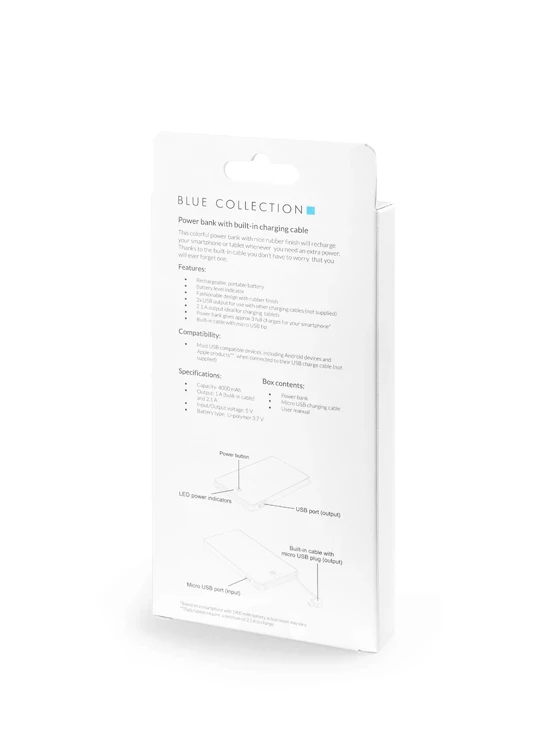 VIVID 4000 mAh maitinimo bankas yra modernus reklaminis įtaisas, kuriame funkcionalumas derinamas su estetika ir kuris yra praktiška dovana klientams ir verslo partneriams. Dėl plono dizaino ir gumuoto paviršiaus prietaisas yra ne tik patogus, bet ir malonus liesti. Integruotas mikro USB laidas ir papildoma USB jungtis leidžia vienu metu įkrauti du įrenginius, todėl padidėja jo pritaikomumas kasdieniam naudojimui. Be to, galimybė ant maitinimo banko paviršiaus spausdinti spalvota UV spauda leidžia efektyviai reklamuoti prekės ženklą.